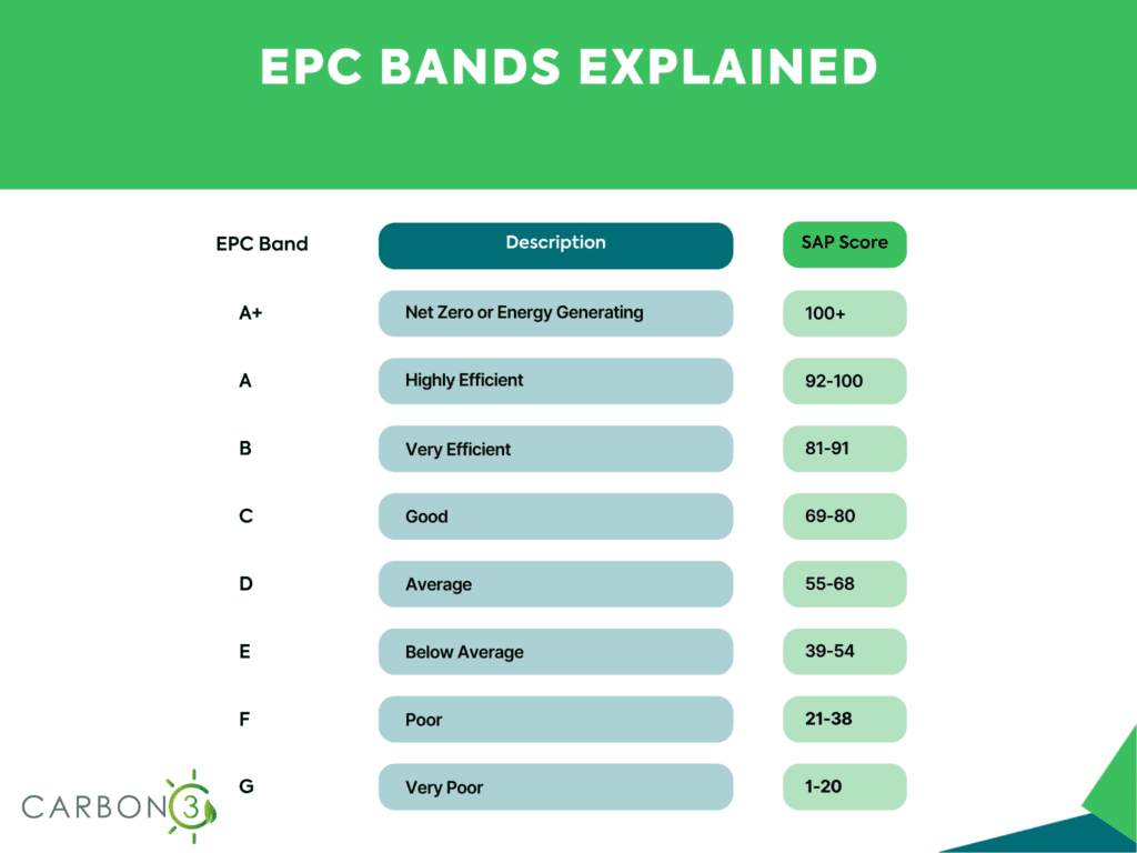 EPC ratings run from G at the bottom to A at the top, with A+ as the highest achievable rating. Each band reflects how much energy a property uses per square metre, and how much of that energy is lost.